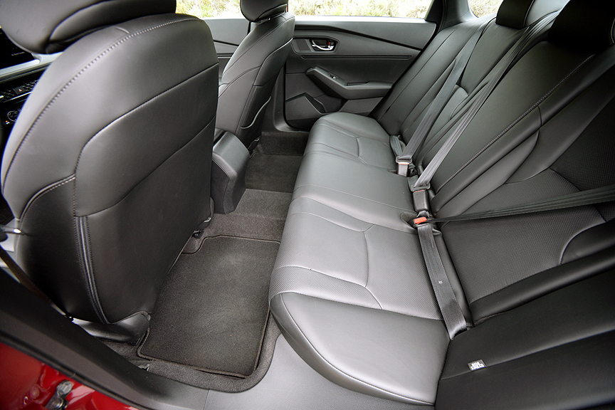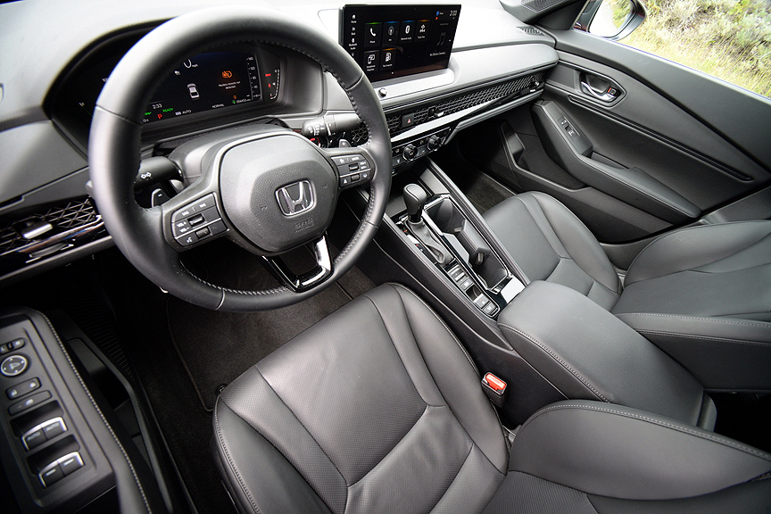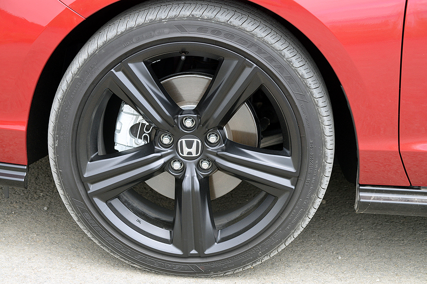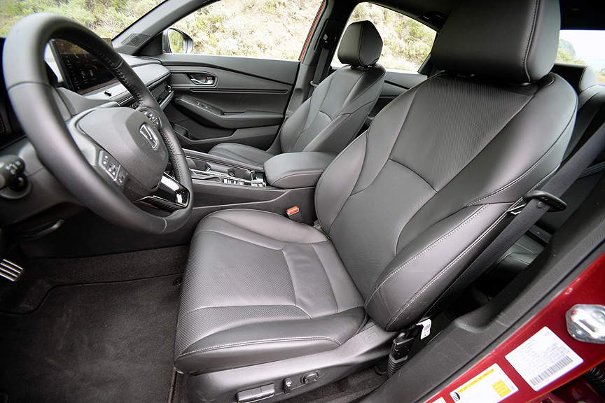 A 2.7-inch increase in length gives the new Accord a streamlined form. That stretch also means a more spacious back seat (41 inches of legroom) and a trunk that now provides 16.7 cubic feet of cargo storage. Its wider rear track is stabilized by a new annular rear bulkhead. This structure uses side stiffeners to plant the Accord's rear suspension more firmly than previous versions. Similar improvements to the dashboard structure match the improvements in the rear. Inside you'll find all new "Body Stabilizing Seats" which offer superior lateral and thigh support. A pair of graphic panels grace the unfussy-looking dashboard. A12.3 inch "Digital Driver Interface" offers a color touchscreen with Google Play, Maps, and Assistant. A 12-speaker Bose stereo includes a volume knob. The 10.2 inch screen in front of the driver reconfigures itself whenever you swap Drive Modes. I found the tiny vertical speedometer on the right edge of the screen to be virtually illegible, but a large digital display somewhat compensates.
