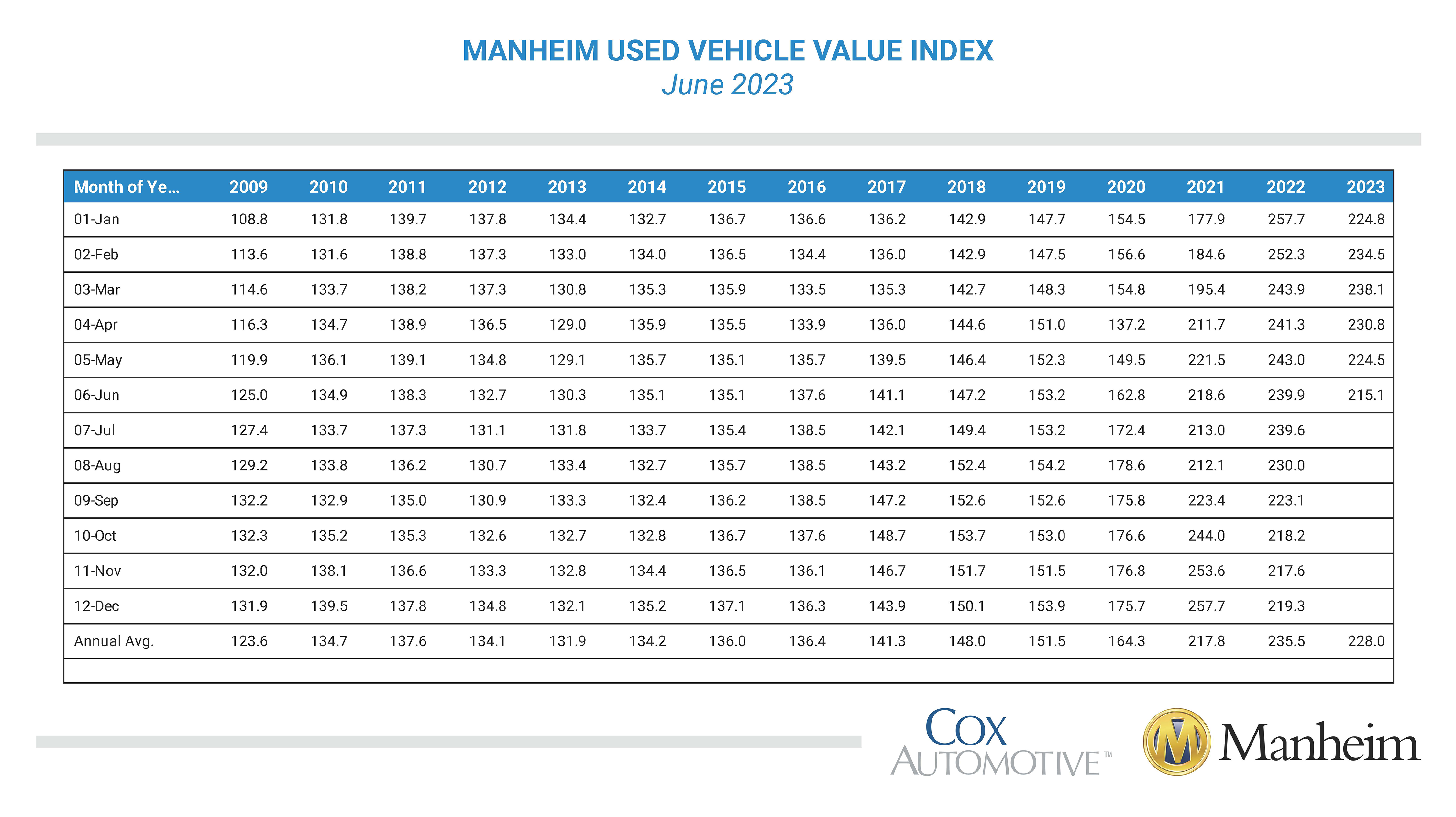 Wholesale used-vehicle prices (on a mix, mileage, and seasonally adjusted basis) decreased 4.2% in June from May. The Manheim Used Vehicle Value Index (MUVVI) declined to 215.1, down 10.3% from a year ago.