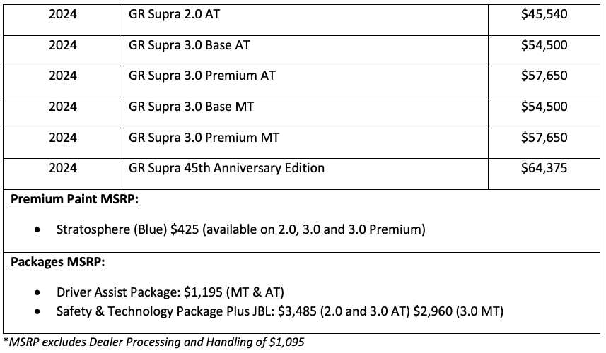 Exterior colors offered across the 2.0 and 3.0 model lineup include Stratosphere (blue), Absolute Zero (white), Nocturnal (black), and Renaissance Red. Mikan Blast is exclusive to the 45th Anniversary Edition. The 2024 GR Supra is expected to arrive on dealer lots this fall with a starting Manufacturer’s Suggested Retail Pricing (MSRP) of $45,540 plus Dealer Processing and Handling (DPH) of $1,095 for the GR Supra 2.0 model. The GR Supra 3.0 model starts at an MSRP of $54,500 plus DPH (AT or MT equipped).