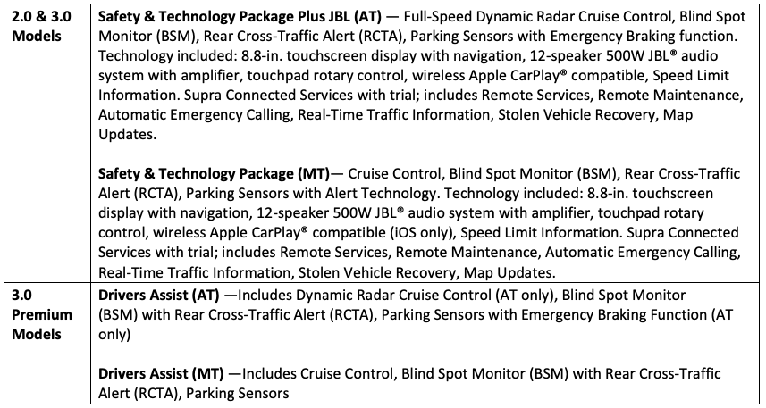 Wireless Qi charging is standard on the 3.0 equipped with manual transmission and 3.0 Premium. Apple Car Play ® is standard on the 3.0 and 3.0 Premium. Upgrade to the Safety & Technology Package with JBL on the 2024 2.0 and 3.0 grades, and get: