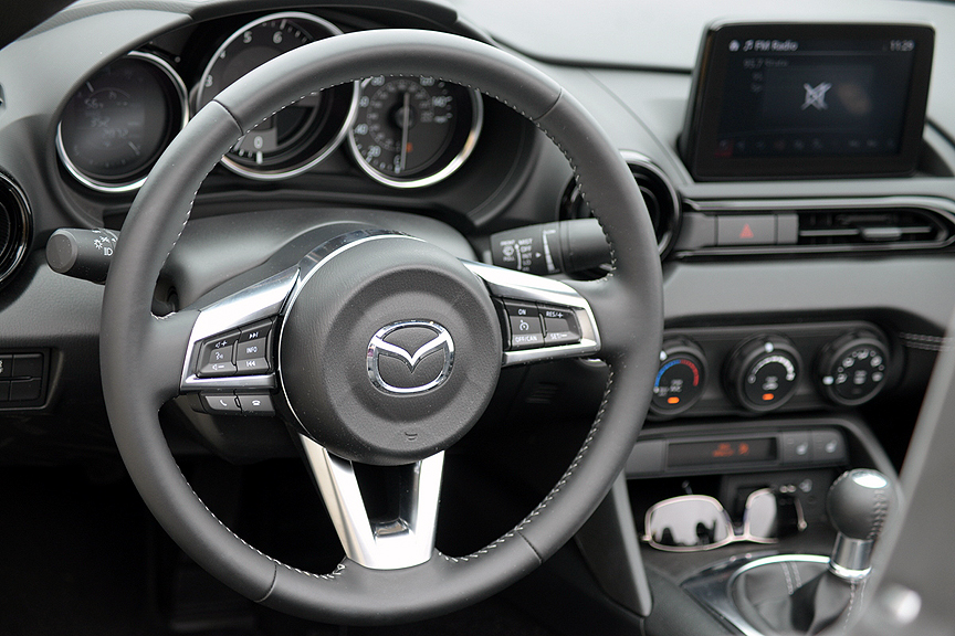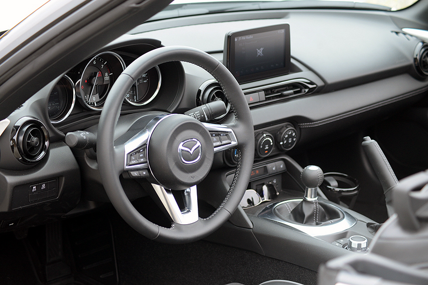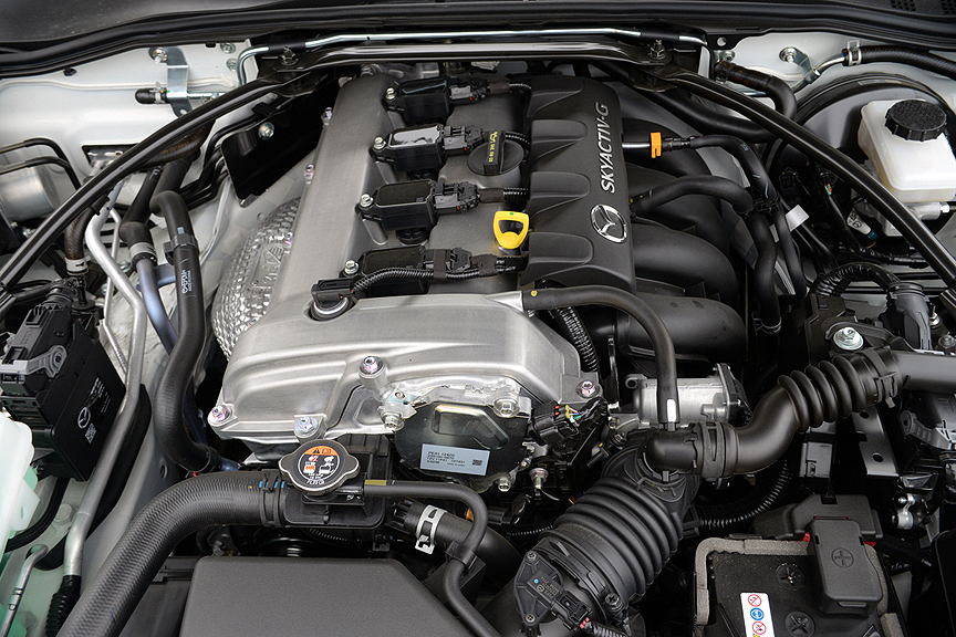 The convertible roof's design is emblematic of the Miata's basic but refined personality. When a sports car weighs as little as the MX-5, it doesn't require a gas-swilling V6, V8 or turbocharged power unit to provide invigorating performance. As it has from its inception more than 30 years ago, the Miata depends on just 4 normally aspirated cylinders for its motivation. When Mazda introduced the original MX-5, they fitted a 1.6 liter inline-4 which produced 116hp and 100lb.-ft. of torque. With a curb weight of just 2,189 pounds, that progenitor was saddled with a sluggish power-to-weight ratio of 18.87 lb/hp.