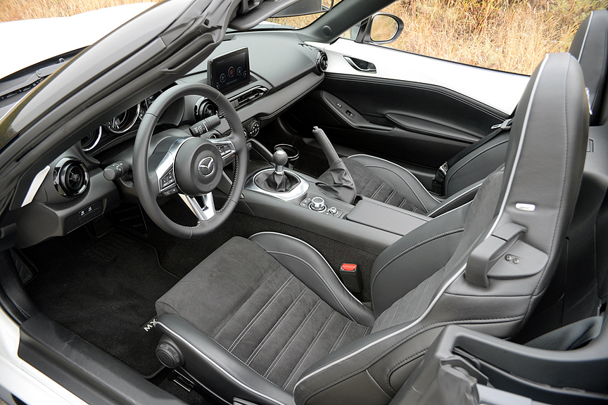 Thankfully, Mazda designers have perfected the roof lowering operation to the simplest protocol imaginable. Reach up and clasp the fat roof release handle just north of the rearview mirror. Automatically, the side windows partially retract, allowing you to swing the lightweight roof backwards into its storage bin. Give it a final shove and the top clicks home, with its forward panel forming its own storage cover. This ingenious roof takes just five seconds to drop, requires no heavy electric motor, and proves equally facile to erect.