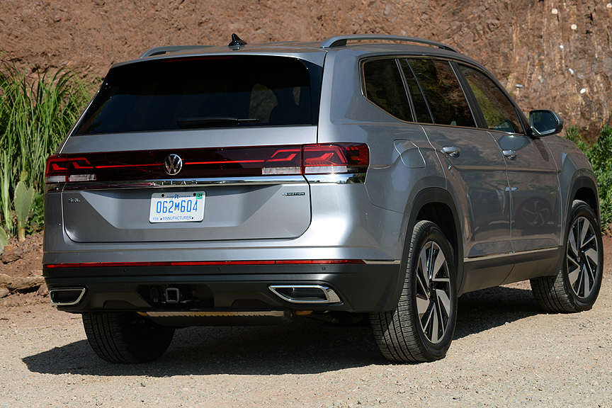 If you're looking for more road real estate for your buck, VW's heavily revamped 2024 Atlas is a perfect choice. This SUV is so spacious (97 cubic feet!) that it could serve as an accessory dwelling unit. The Atlas we tested was VW's SEL model, which carries a base price of $48,445, and an as-delivered price of $50,490. There's only one higher echelon available, the SEL Premium R-Line which retails for $53,805. A set of 21-inch alloys upgrade the R-Line from our test SEL's 20-inch rims. Unlike the previous Atlas lineup, which offered both 4 and 6-cylinder engine options, the 2024 model line eliminates choice in favor of just one 4-cylinder turbo motor driving 2 or 4 wheels through an 8-speed Tiptronic gear box. Our SEL was equipped with standard 4MOTION. The new 2.0-liter turbo falls just short of the old V6 in horsepower (269 vs. 276), but is 34hp more powerful than last year's 235hp base 4-cylinder motor. VW equips the SEL with a standard tow hitch and oversize rear-view mirrors and assigns it a tow capacity of 5,000 pounds.