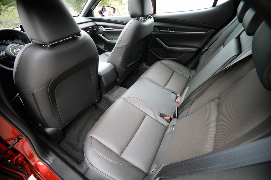 The interior of the Mazda3 presents a worthy playground for the enthusiast driver. One of the first items we look for in a purported performance car is the presence of a dead pedal. That's the ramped support located in the lower left corner of the driver's footwell that allows you to stabilize your lower torso against g- loadings. Mazda wouldn't miss providing one, and they up the ante with a pair of nicely side-bolstered, leather wrapped front bucket seats, a grippy, thick rimmed steering wheel, and a stubby, simple shift lever complete with paddles for manual mode activation.