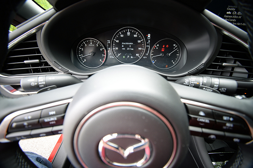 The Premium Plus trim level provides you with every trick in the convenience handbook. The front seats heat themselves in three stages, and the steering wheel likewise can be warmed. The right spoke of the steering wheel contains clearly labeled cruise control paddles, the left side of the dash offers a pair of memory positions for storing seating preferences, and the dual-zone automatic climate control is thankfully equipped with manual controls for temperature and fan operation. In other words, the Mazda3 offers a fully human compatible driving environment - with one notable exception. Our early production 2024 vehicle included the infotainment control wheel that has long plagued Mazda owners with its sphinx-like reticence to operate in a predictable fashion. However, preliminary reports indicate that this device will be replaced with a touchscreen in all Mazda3 models save the Base offering. It can't be gone soon enough.