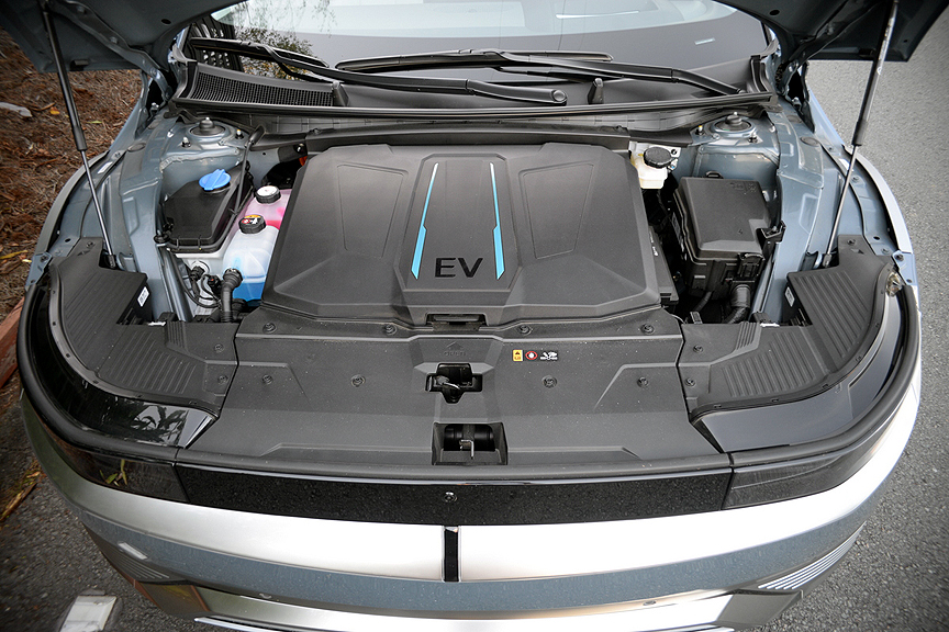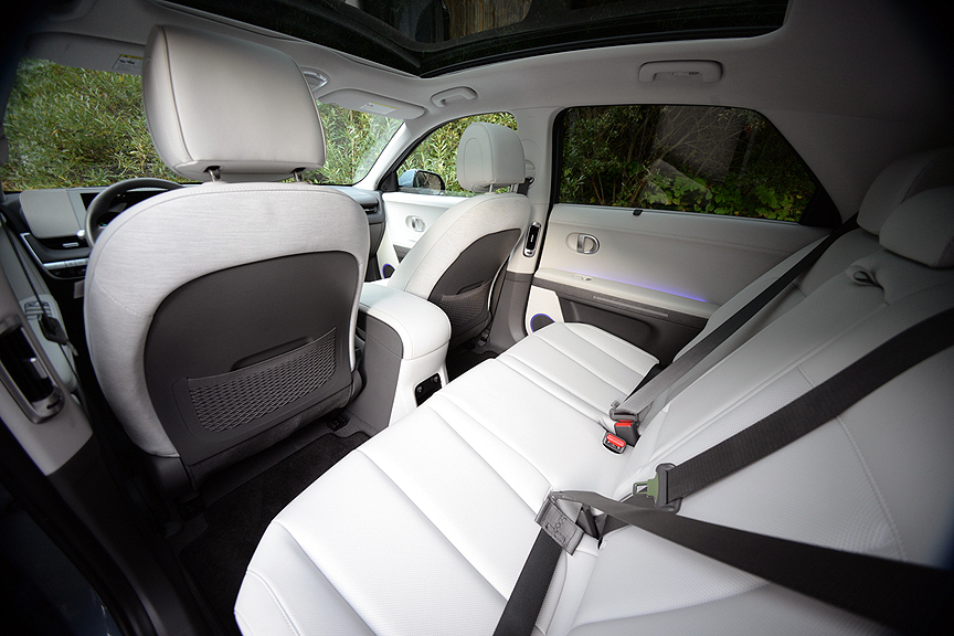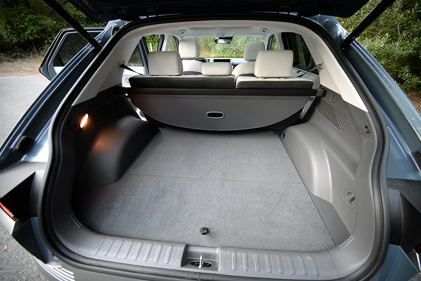 Attaching the shift stick to the steering column also provides another major benefit. Since there's no longer a need for a center console to house the shift mechanism, Hyundai eliminated the space-hogging center console in lieu of an open floor plan with brilliantly conceived storage bins. This revision makes the front seats of the Ioniq feel spacious and unimpeded - like the kind of living room you'd expect to find in an adventure van or motor home. Another bonus of the Ioniq 5 is its deceptively large cargo capacity. This cleverly honed capsule may look like a sports sedan from the outside. But once you lay the rear seats flat (a couple of lever tugs does the job), you've created a flat load floor big enough to haul a full-size bicycle around! That's not at all the impression you get from looking at this sleek missile from the outside, but in reality, it will swallow 28 cubic feet of stuff.