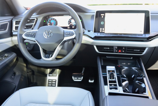 For this 2024 model drive experience I drove a SEL Premium R-Line finished in Kingfisher Blue Metallic with a Chalk and Titan Black leather interior. My previous Atlas Cross Sport drive experience was in a model with the VR6. I like that engine very much and am sad to see it go. The new turbo 2.0-L performs nicely with good low-end torque delivering quick acceleration and good mid-range performance for highway merging as well as passing maneuvers. There is the characteristic NVH of a 4-cylinder that is ever present, but not to a fault.
