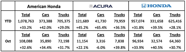 - American Honda sales up 32.6% in October (108,088 units), despite supply constraints for some models