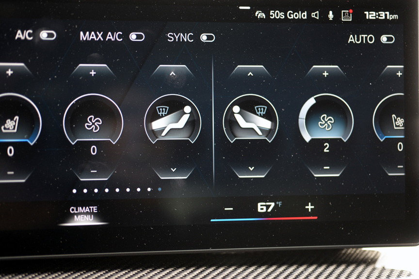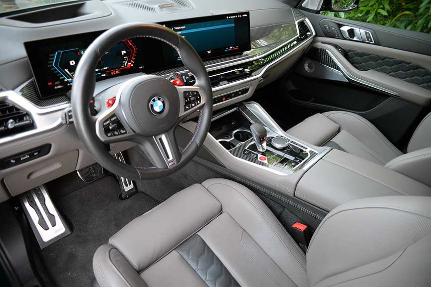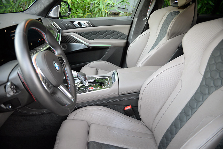The fully bolstered sports racing-style front seats offer tremendous lateral support. they are finished in "Adelaide Grey Full Merino Leather," with a chain of darker grey hexagonal blocks running up the center line like puffy racing stripes. The thick rimmed steering wheel is beautifully tailored with M Brand red and blue stitching, and BMW has lavished a treasure trove of carbon fiber on the large vertical dash front, as well as carbon door inserts. The center console and its retractable cover plate are spectacular in carbon. A series of illuminated green chevrons draw attention to the "M" moniker embedded on the passenger's side of the dash.