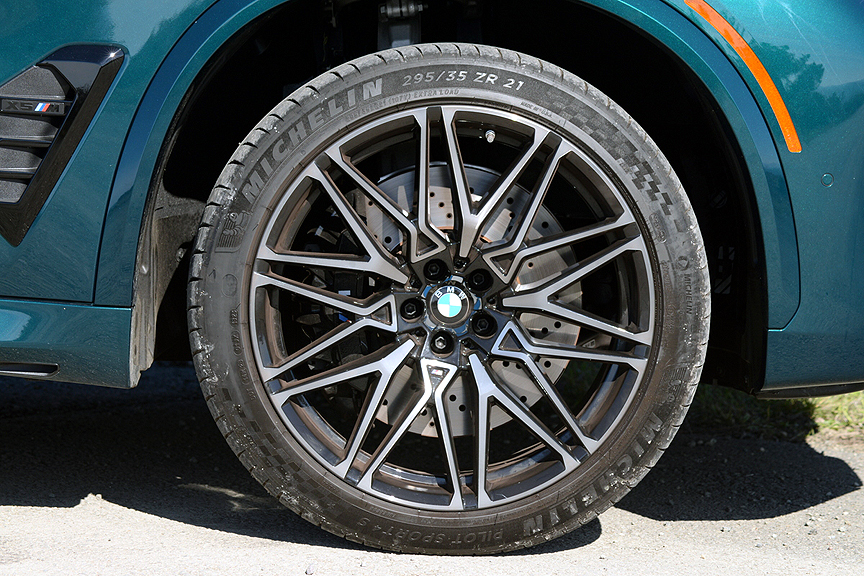 If sheer speed is not your thing, you might want to consider lesser X5 derivatives. Because the Competition is primarily race-bred, its ride and handling characteristics focus on paying race track dividends. In fact, in addition to Road and Sport Drive Modes, BMW adds Track Mode to the available portfolio. Selecting Track Mode disables most of the safety net crutches we've come to expect in everyday street driving (speed limit info, forward collision warning, active blind spot detection, rear end collision preparation, hazard flashing with hard braking). While all these aids may prove useful at times on the street, they are nothing but a nuisance on the track, and kudos to BMW for letting you delete them wholesale when you run your X5 M in Track Mode. Another bonus in the race portfolio of this SUV is the ability to select "M Dynamic Mode" which allows higher longitudinal and lateral acceleration levels without interference from systemic nannies. As BMW puts it so succinctly, "Only in the absolute limit range does the system intervene for stabilization by limiting engine power and by brake intervention on the wheels." In other words, you have to do something really stupid to provoke intervention in M Dynamic Mode. As you might expect, BMW equips the Competition X5 with a track-worthy set of Michelin Pilot Sport 4S tires that carry a ZR rating good for speeds above 186mph. The X5 M uses staggered rims and tires, with the front Michelins measuring 295/35 ZR21 and the rears upsized to 315/30 ZR 22. Treadwear Rating 0f TW 300 means you'll be visiting your Michelin dealer regularly. Wet traction earns an AA rating. The X5 sticks like a leach, though it does feel a bit top heavy as its Michelins bite into each corner with such ferocity that it makes your head toss from side to side.