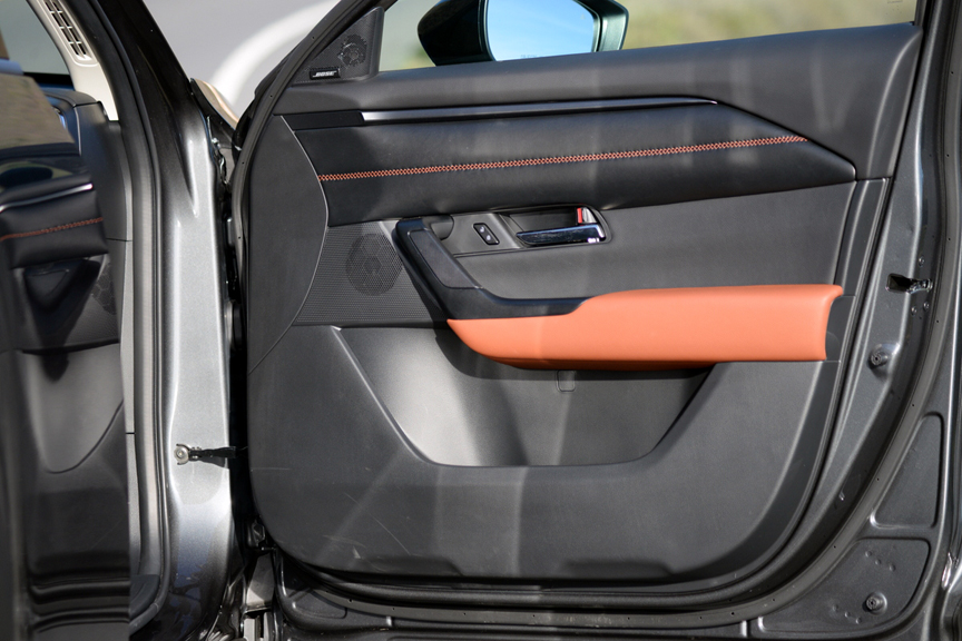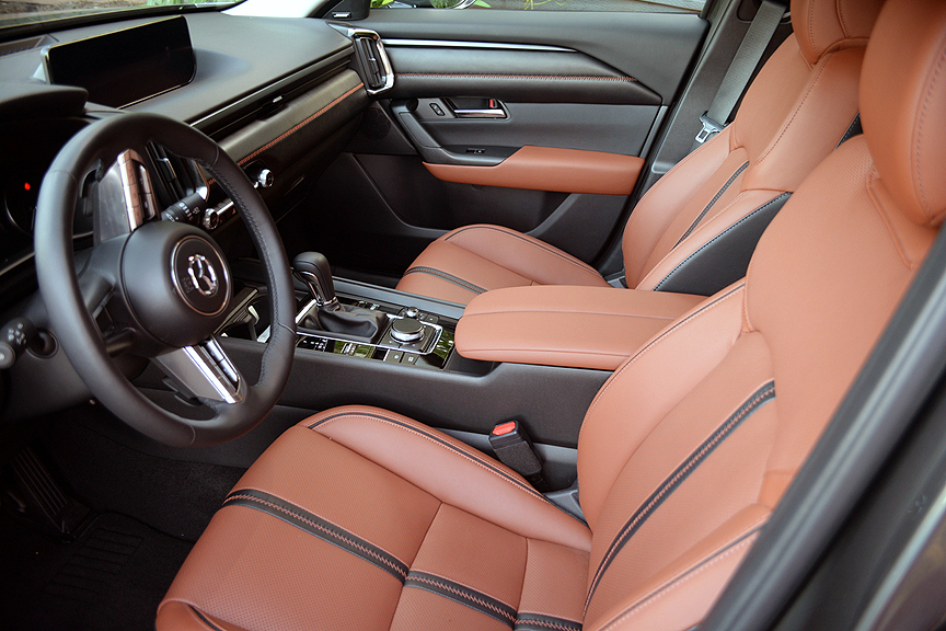 For 2024, Mazda has introduced a lovely open roof feature called the Power Panoramic Moonroof. This glass roof, which was not previously available on the CX-50, opens your eyes to a world above and beyond the confines of the interior. A sliding screen retracts nearly the entire length of the cabin to bring the outside world into stunning view. In addition to this drama, Mazda has concocted a lively and handsome interior for the CX-50 Premium Plus that uses shades of Terracotta to turn the cabin into a virtual fiesta. The very supportive front bucket and rear bench seats are brought to life with colorful insert swatches that make this Mazda look much more expensive than it actually is. Even the face of the dash and the tops the door panels are energized with contrast color stitching that looks just right in a Southwestern sort of way.