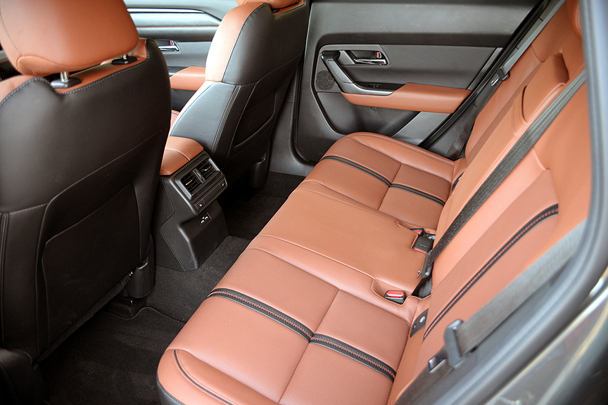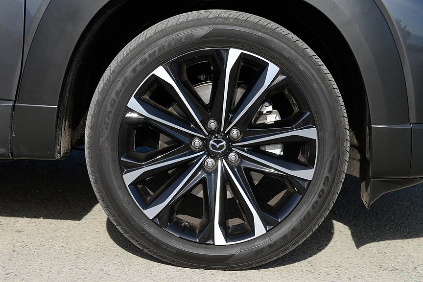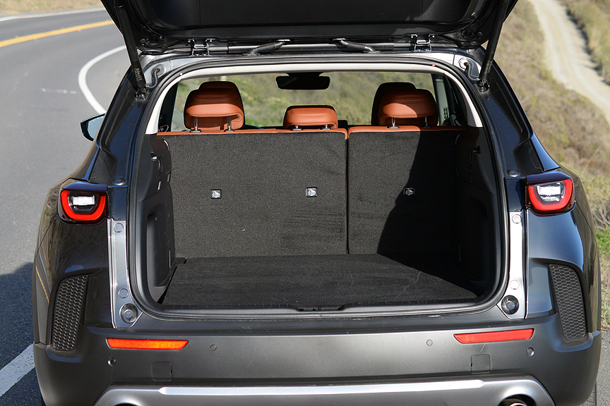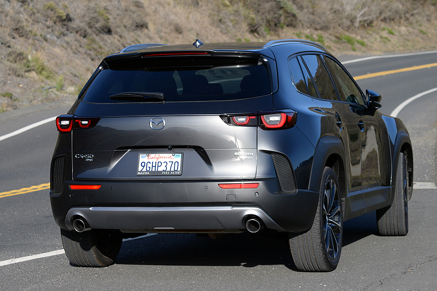 The turbo version we tested was the Premium Plus model, which carried an MSRP of $43,300. With only a $595 extra charge for Machine Grey metallic paint, the as-delivered cost totaled $45,270. In today's inflation-bloated automotive world, that figure slides in just below the average new vehicle transaction price. And considering the refined driving characteristics of our test Mazda, as well as its sophisticated and lovely interior furnishings, this little SUV has to be one of the best deals of the new model year. Mazda has always placed a premium on good handling, and the CX-50 continues that tradition with a new suspension system called Mi-Drive which puts a premium on your specific handling needs. Mi-Drive offers three distinct driving modes. Sport Mode provides excellent steering wheel feedback, as well as a tenacious cornering grip when tackling paved back roads. In this application, the generously sized (245/45R20) Goodyear Eagle Touring radials (TW 500) communicate road feel with welcome certainty. For bashing the outback you'll want to select Off-Road Mode. When outfitted with a Mazda-issue hitch, this CX-50 is well configured for pulling a trailer because Mi-Drive offers a Towing Mode.