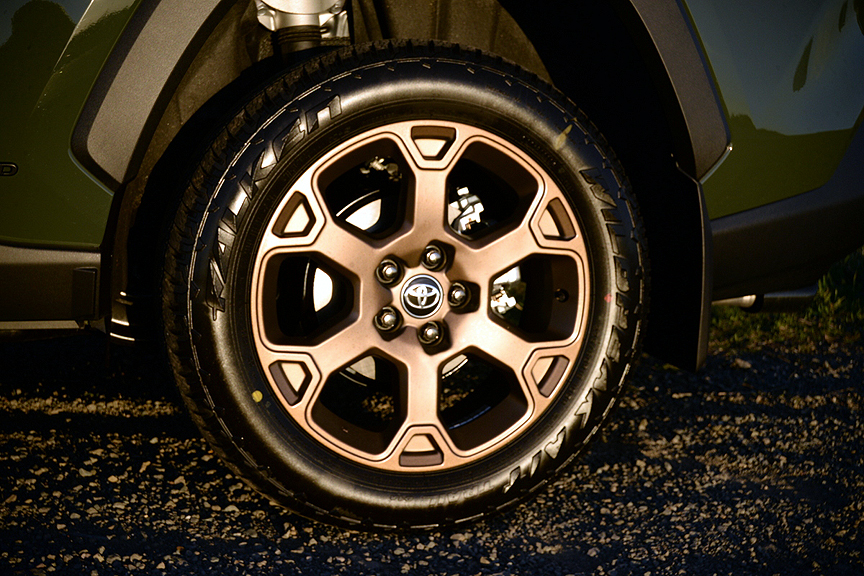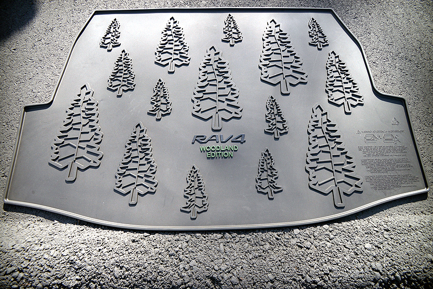 This value package is specifically outfitted to appeal to the outdoor enthusiast. Toyota Racing Development (TRD) tuned the Woodland's all-wheel drive "integrated management suspension" for off-road competence by raising ride height to 8.1 inches. This revision enables a more generous approach angle of 19 degrees and a departure angle of 21 degrees. Each Woodland is fitted with six-spoke, bronze colored TRD "flow-formed" alloy rims shod with Falken WILDPEAK all-terrain tires (225/60R18).