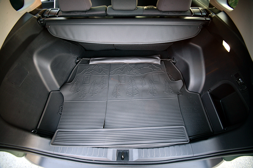 The Woodland's appealing interior is protected by a full set of all-weather floor mats featuring tall trees plus the Woodland name in green. The easy-to-clean format extends to the fabric-trimmed seats which look sharp thanks to silver embossed polygonal inserts. Lift the tailgate and you discover a height adjustable rear cargo area deck board. Particularly clever is the center console between the front seats which incorporates a covered storage compartment and two cup holders, as well as a Drive Mode button, a Multi-Terrain Select (MTS) knob, and best of all a real stick shift with a conventional PRNDL pattern. Drive Modes offered are SPORT, Eco, NORMAL, EV and TRAIL.