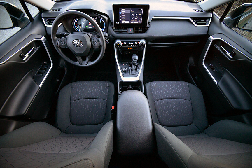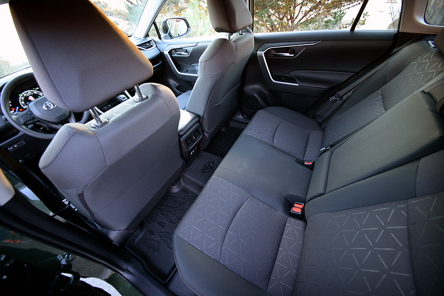 The Woodland's 2.5 liter inline-4 cylinder internal combustion engine produces 176hp @5300rpm. It derives added boost from front and rear electric motors which up combined horsepower to 219hp. A sealed nickel-metal hydride battery provides 244.8V of juice which is parceled out to all four wheels by an electronically controlled continuously variable transmission (ECVT). Driving this rig on paved roads proved effortless. With a curb weight of just 3,775 pounds, the RAV4 Hybrid is quick enough to cope with all the challenges you're likely to encounter on your daily drive. Acceleration numbers prove the point: 0-60mph takes 7.4 seconds while the standing start quarter mile is achieved in 15.7 seconds at 91mph. When you stomp the throttle this RAV4 Hybrid jumps forward while the driveline emits a faintly ethereal whine. The ECVT transmission requires no management from the driver to extract maximum thrust from the engine compartment. Handling on back roads is predictable, but due to the Woodland's 8.1 inch ride height bump, it feels a bit top-heavy when transitioning through S-bends. While the front seats are quite supportive for freeway runs, we found they lacked lateral support for the quick transitions of backroad driving. Around town, however, the extra height is a bonus which allows you better vision in traffic and better sightlines when parking. With its abundant storage space (30.5 cubic feet) and its 60/40 split rear bench seat, the RAV4 Hybrid affords a multiplicity of interior configurations that are thankfully simple to achieve.
