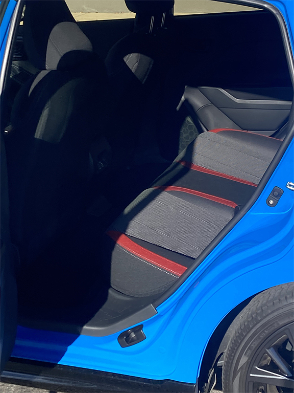 The interior, although predominantly shades of gray, has nice accents to brighten things up. The front seats were comfortable even though they look sporty. The rear seat, like so many, is fine for two but gives short shrift to the middle passenger.
