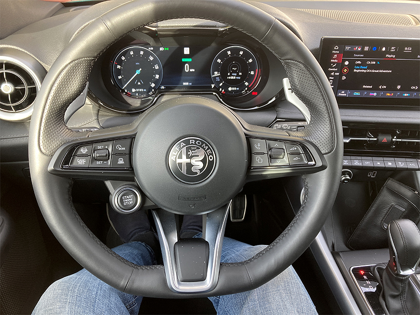 I don't drive test cars hard, it's not my style. I want to know how a vehicle behaves in real life, not on the track. Generally, I would say I was pleased with the overall performance of the Tonal - ride, handling, acceleration, braking, comfort, and ease of access. With the "ALFA DNA" switch in "n" (for normal) position the ride was stiff but not harsh (except for speed bumps). I put it in "d" for dynamic once and let's just say in the real world it was unacceptably harsh; track only in my opinion.