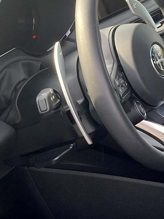 Take the paddle shifters. I rarely use paddle shifters; I guess they are nice on a sports car with an automatic transmission but do they have to be so big that they hide the turn signal and wiper stalks when the steering wheel is straight? With a set up like the Alfa's I understand why drivers don't use turn signals.