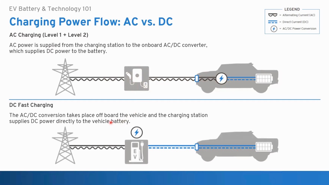 First, the standard method of getting the household alternating current (120-volt or 220- volt AC) into your vehicle requires several conversions, first to direct current (DC) for the battery and back to AC to run motors. GM’s Andy Ouray outlined the process in a seminar hosted by the Midwest Automotive Media Association.
