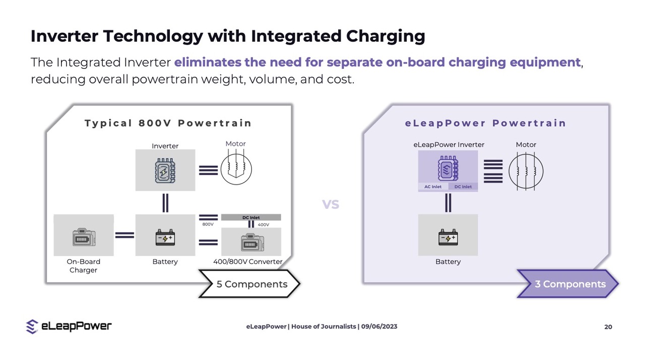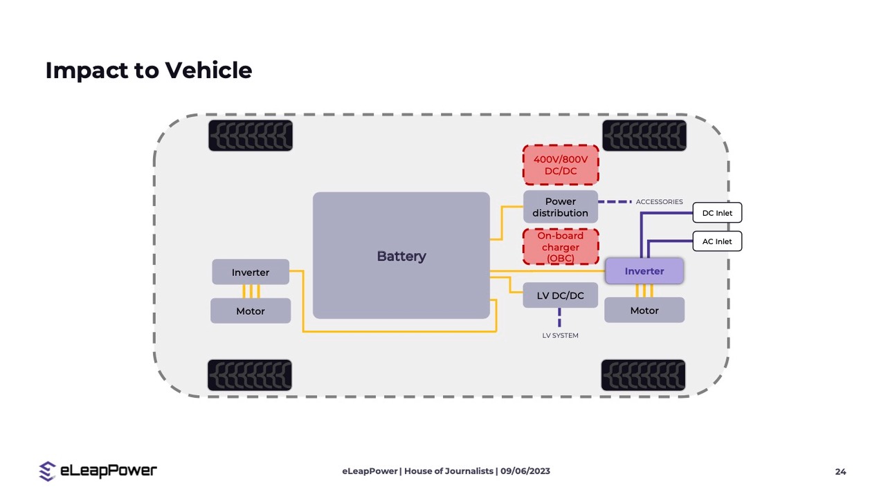 eLeapPower says their technology does away with both the 400V/800V DC/DC and onboard charger, substituting only their inverter, which does it all.