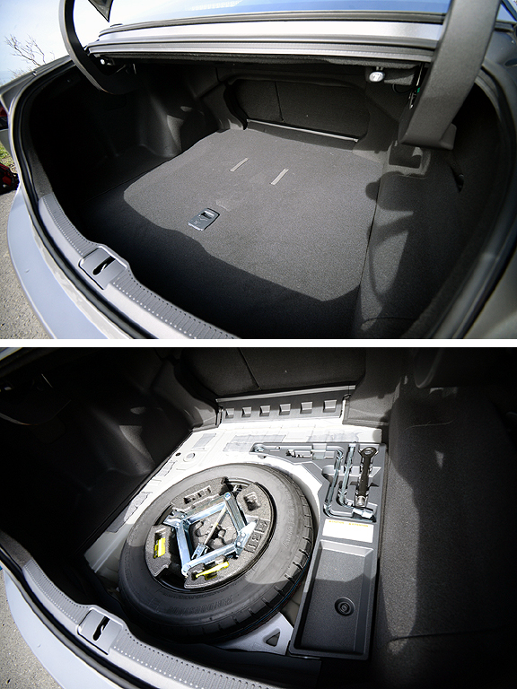 Open the trunk with the remote button on the key fob because you'll never find the exterior release Toyota has managed to conceal from touch or view. When you do find your way into the baggage compartment you will discover a real (albeit Spacesaver) spare tire complete with all the tools and jack you'll need for an emergency roadside swap. You'll also discover the non-hybrid 12V auxiliary battery stowed behind a partition in the right rear corner of the trunk. So never lock up the Crown's electric joules without maintaining free access to the trunk. The storage space offered here is quite usefully shaped to provide 15 cubic feet of room.