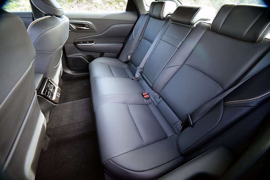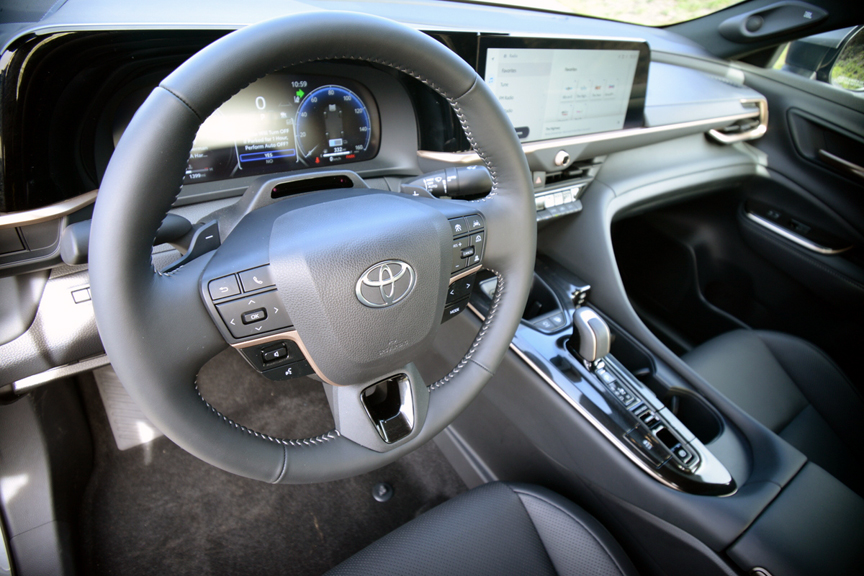 But inside the spacious confines of the Crown's cabin, the pitch is about comfort, not high performance. The commodious seats are tri-temp heated and ventilated up front, and heated in back. Even the steering wheel rim offers two levels of warmth. We didn't see much evidence of platinum inside the Crown, but Toyota did take pains to finish the subdued black dash and door panels with flashes of rose anodized aluminum trim. The dash is thoughtfully supplied with a welcome array of physical buttons to activate fan, heat and air conditioning choices. An equally easy to operate 12.3 inch "Audio Multimedia" display screen eases selection of your favorite SiriusXM stations during a free 3-month "Platinum" trial. JBL provides a luscious 11 speaker sound system complete with subwoofer and amplifier, and wireless smartphone charging is offered on the console between the front seats.