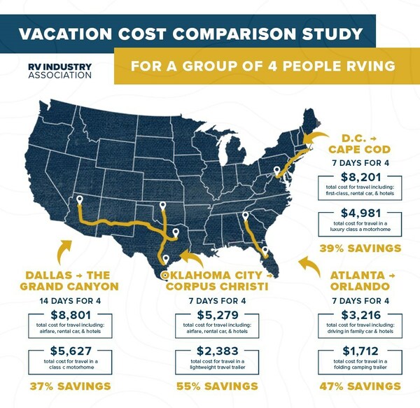 Even when factoring in the total cost of RV ownership and use, including gas, food, and campground fees, a recent study found that an RV vacation for a family of 4 costs an average of $350/day, significantly less than other forms of travel.