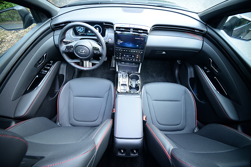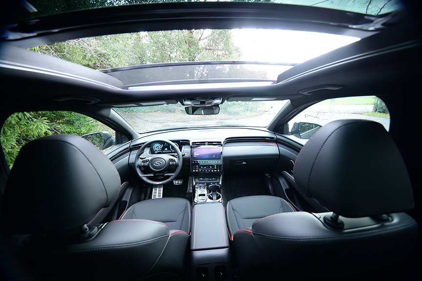 The revised look of the N-Line version starts with model-exclusive gloss black front and rear fascias, N-Line badging on the flanks and tail, plus gloss black exterior trim accents. N-Line specific 19-inch alloy rims support 235/55R16 Michelin Primacy A/S radials that are mud and snow-rated. A chrome plated twin exhaust pipe is also exclusive to the N-Line Tucson. Inside the spacious cabin a pair of very comfortable N-Line front seats look like they belong in a race car, with deftly stitched red-on-black trim and piping, and bold N-Line embossed headrest emblems.
