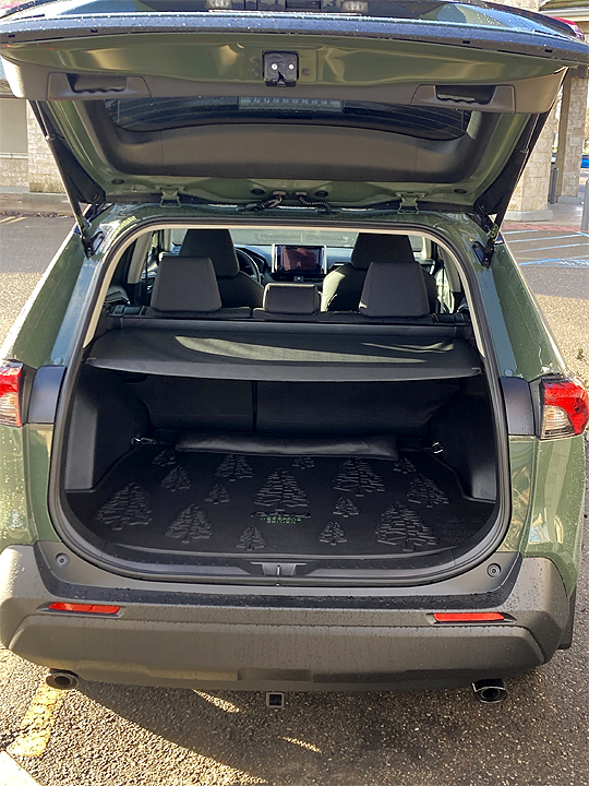There is plenty of storage in the back - 37.5 cubic feet behind the rear seat to be exact, and 69.8 cubic feet with the rear seats folded. You can see the fir trees on the cargo mat; the mat is easily removed and can be hosed off.