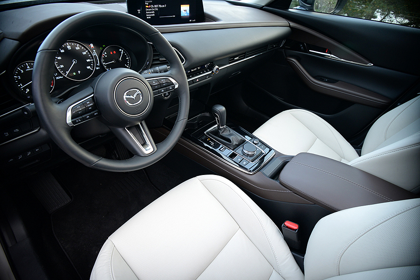Of course, there's far more to this story than backroad bashing. The CX-30 also functions as a perfect small family wagon, with comfy seating for 4 or 5 in a pinch, and just enough storage space (20 cubic feet) behind the rear seats to make day-tripping for four adults a realistic proposition. The interior of the upper echelon "Premium Plus Package" version we drove featured well countured leather-trimmed front seats with heaters. The hand grips of the steering wheel were heated, a power sliding glass moonroof brightened the brown and white interior, while a power rear liftgate eased loading chores. Auto on/off headlights and rain-sensing wipers helped weather the storms.