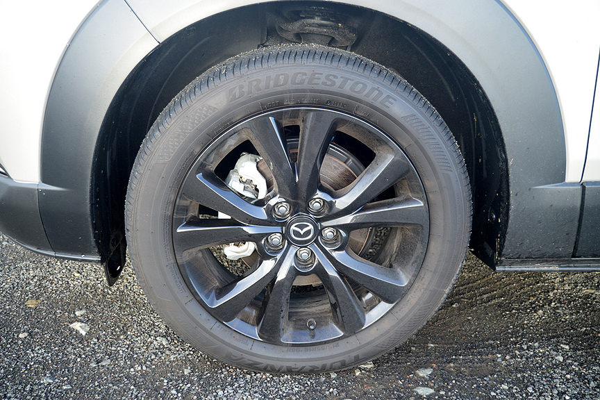 It's not the kind of performance dividend you'd expect when judging its tame looks, or underwhelming tire footprint. Mazda bolts a set of 18-inch black alloy wheels to each corner and equips them with modestly sized (215/55R18) Bridgestone Turanza EL 440 radials that are not only mud and snow-rated, but also carry a hard treadwear compound of TW 480. Not exactly the hot ticket if you plan on taking your CX-30 to an autocross. But on streaming wet pavement, in the middle of an epic storm, you better believe this petite Mazda and its all-season Bridgestones proved its mettle. The turbo engine proved lag-free and surge-resistant. The 6-speed, paddle-controlled, gearshift could be slipped into manual mode, where it obeyed every gear command without hesitation. Those innocuous-looking Turanza radials never lost an iota of grip, the front and rear window wipers proved completely adequate to their daunting task and never aquaplaned once. I can't think of any other vehicle I would rather have driven on that nasty day.