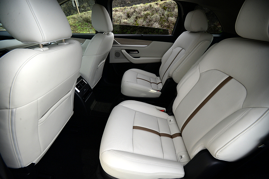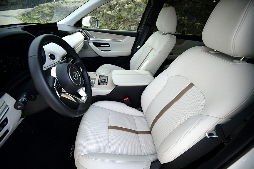 But the real peep show here occurs when you open the door. Mazda interior stylists have achieved a new level of perfection. The first item to greet your eyes is the door panels, finished in a fetching combination of premium white leather and blanched driftwood. The nautical hints continue with white Nappa Leather seats trimmed with subtle grey vertical racing stripes. Attention to detail is explicit throughout the roomy Premium Plus level cabin. The front seats as well as the second-row captain's chairs (with center walk-through) are heated, as is the steering wheel. You can upgrade to the $725 Ambiance package which provides illuminated door sill trim plates and logo puddle lamps. But there's plenty of luxe ambiance even without those lily-gilding options. The Preferred Plus CX-90 is done to the nines and definitely worth the extra buy-in bucks.