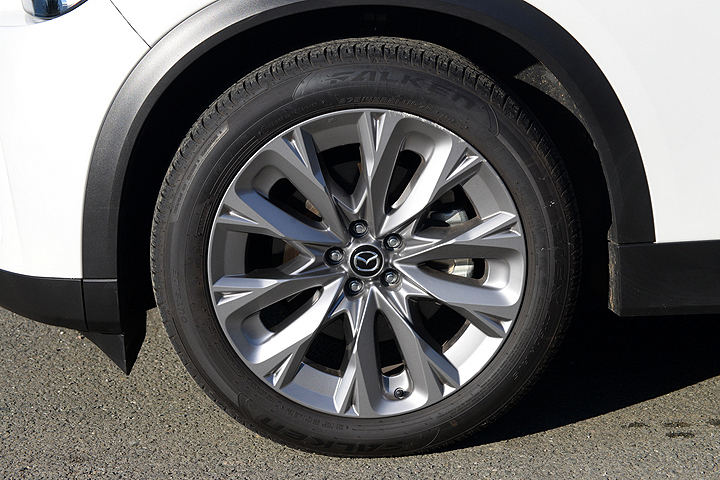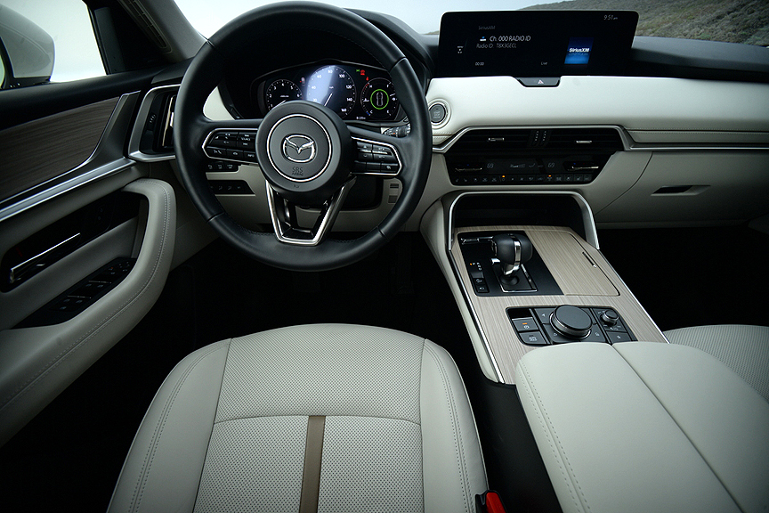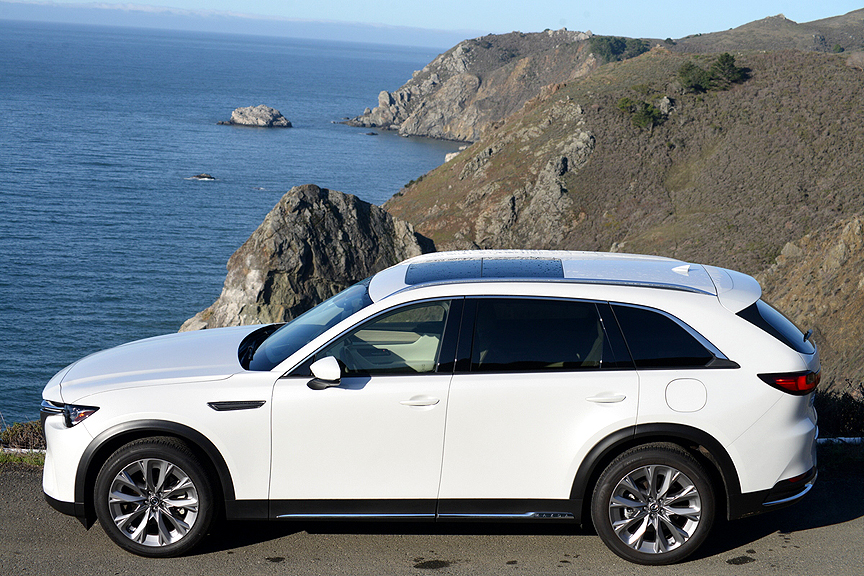 Handling has always been Job One at Mazda. That's easy to accomplish when you're designing and refining a two-seat sports car like the 2,335-pound MX-5 Miata or even the 3,025-pound Mazda3 sedan. But what happens when you try to inject that sporty DNA into a 7-seat 4,964-pound SUV that weighs nearly twice as much as the Miata? First, you make the contact patch of the tires as big as possible. Mazda bolts a set of 21-inch, 10-spoke alloy rims to each corner, each mounting oversize Falken Ziex CT 60 A/S radials measuring 275/45R-21. Then engineer a perfectly balanced platform that splits curb weight optimally at 51% front and 49% rear. Finally, dial-in steering feedback that is perfectly weighted, with a system that offers enough boost to facilitate easy directional change without smothering feedback at the steering wheel. It's not an easy compromise to achieve, and most large SUVs I've tested miss the mark by a mile. But the CX-90's solution is spot-on.
