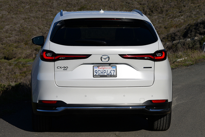 That incident was about the only stain that blotted the Mazda's copybook during my week with this behemoth new SUV. I could tell how large it was when I positioned it for photography. In spots where my telephoto lens would normally capture an entire vehicle, I found myself having to move back an extra ten feet to frame the vast CX-90 in my viewfinder. For the record, the CX-90 is a replacement of sorts for the company's outgoing CX-9 SUV. Although the 90 is only one inch longer than the 9, it's wheelbase is 10 full inches longer than the departing model. This reallocation of interior space allowed Mazda to add a third row of seats to the CX-90 with seating for 7 in our test model (in a 2/2/3 arrangement). Slightly increased width and height over the CX-9 have bumped cargo capacity from 34 cubic feet to 41.5 cubic feet in the CX-90. This in turn allowed me to easily insert a full-size bicycle through the hatch of the CX-90.