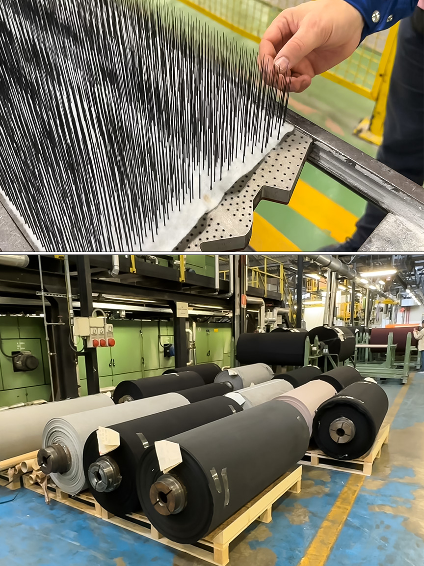A series of needles with microscopic hooks intertwines individual fibers into a material mat, ultimately producing a roll of Alcantara material.