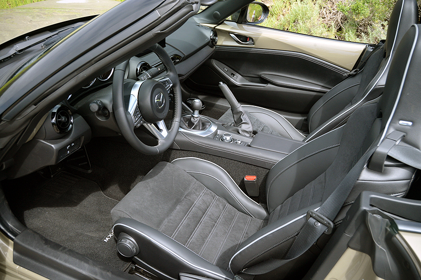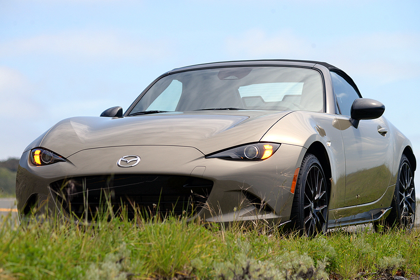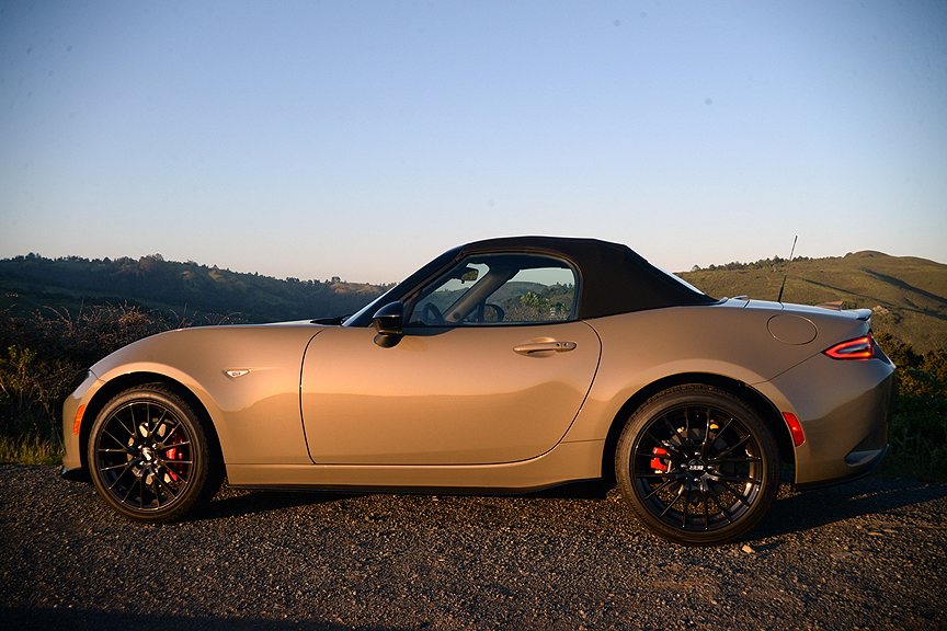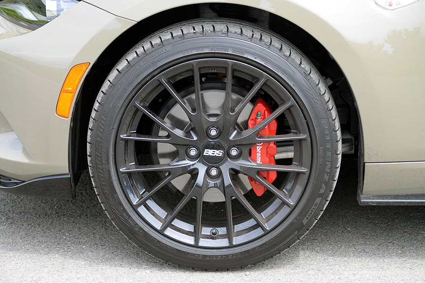 Unfortunately, manual transmission sports cars are disappearing from the market with such regularity that few are left to choose from these days. One of the very best is the snappy 6MT (6-Speed Manual Transmission) Mazda supplies to the MX-5. Smooth clutch actuation takes some practice, but once you ascertain the proper engagement point, the manual Miata's transmission becomes a pleasure to operate. Perhaps the most satisfying aspect of driving the stick shift MX-5 is its hyper accurate ratio selection. Banging home gear changes is like putting the bolt action of a rifle through its paces. No slop or wasted motion means there's never a question about what gear you've selected. The 6MT Miata provides a level of pure driving pleasure that few will experience today. If you want to take the precision experience to the next level, be sure to opt for the $4,800 "Optional Equipment Package" which transforms the looks and behavior of the Club Miata into a track-ready toy. Your five-grand investment starts with the "2AP Appearance Package for Club" consisting of a front air dam, rear lip spoiler, side sill extensions, and a rear bumper skirt. These upgrades help smooth airflow over the Miata and keep it pinned to the pavement on the race track. The "2BB Brembo/BBS/ Recaro PKG" replaces the MX-5's stock disc brakes with competition-worthy Brembo calipers front and rear. It also supplies 17" forged BBS dark alloy wheels shod with track-worthy Bridgestone Potenza S001 (205/45R17) tires with a sticky grip rating of TW 280. The final enhancement of the optional equipment bonanza is a pair of supportive Recaro heated sports seats that will glue you in position just as solidly as those BBS wheels and Potenza tires will stick your Club model to the pavement.