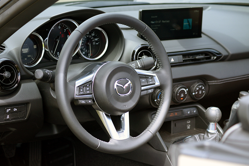 Having driven both the soft top and retractable hard top versions several times over the past few years, I would definitely opt for a convertible model identical to the 2024 model tested here. For one thing, the RFs are slightly more top-heavy than the convertibles. Secondly, the fixed sections of the RF roof slightly obscure side and rear vision. If you're after the full top-down roadster experience, stick with the convertible. Besides, you will never believe how simple Mazda has made the task of raising or lowering the canvas top. One pull of the centrally located windshield latch disengages the top from the windshield header while simultaneously lowering both side windows half-way. This allows you to swipe the folding roof back with one hand and store it in its receptacle.