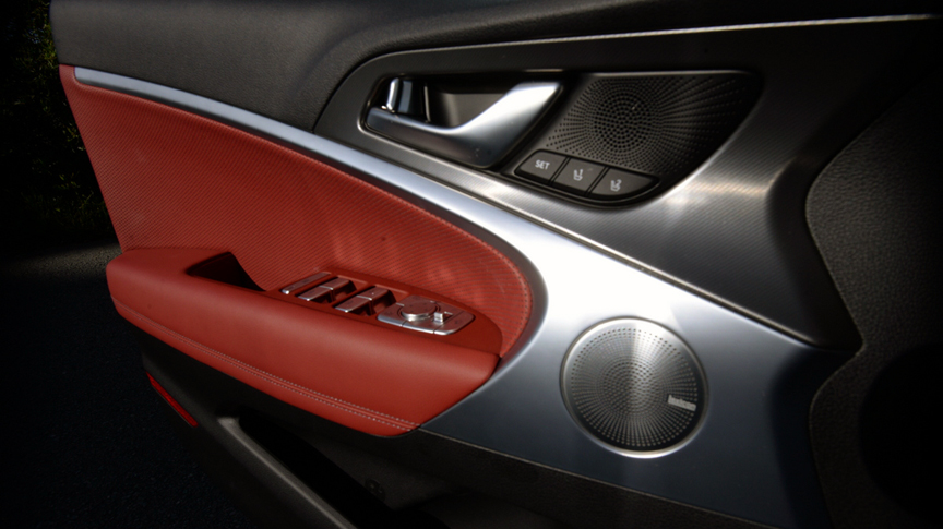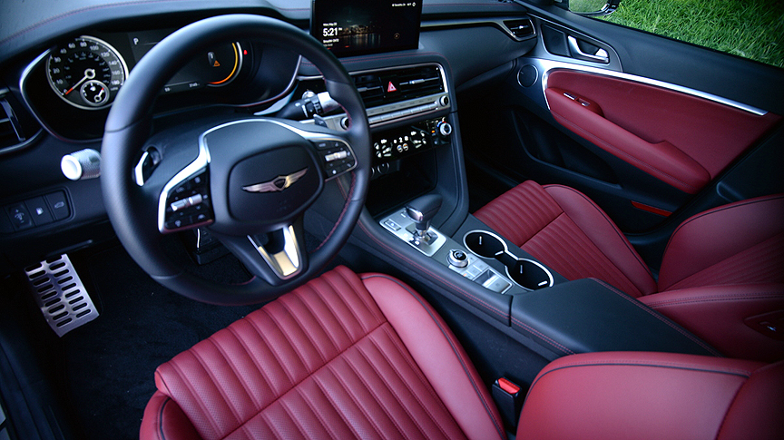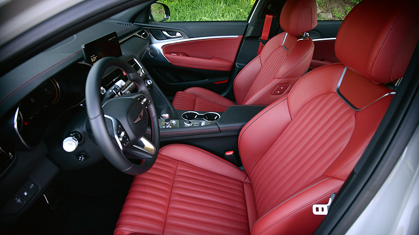 To make the G70 fully competitive with BMW's 3 Series, Lexus' IS300 and Audi's A4, you need to pop for the $4,200 Sport Prestige Package which upgrades the looks and interior of the Genesis with the beguiling niceties. The dark chrome grill and external detailing looks appealingly subtle. The exterior mirrors fold when you lock the car. A Genesis logo puddle lamp illuminates the pavement when you alight at night. The package also provided a quartet of spectacular red leather seats and belts, ventilation (in addition to standard heating) for the front seats, sport aluminum interior trim, and a Lexicon premium audio system. All in all, quite a bargain for the modest asking price.