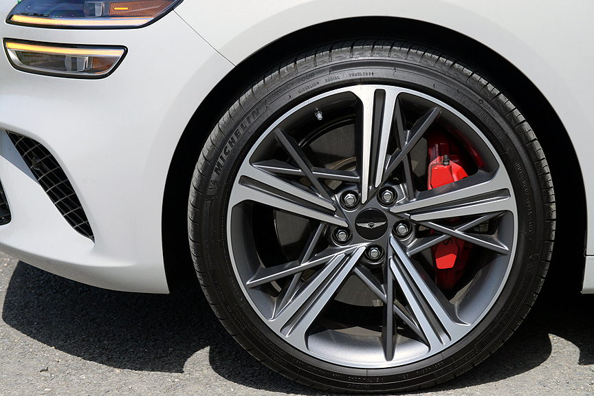 Driving the G70 was a largely pleasurable experience. It proved especially strong in the acceleration department for a 4-cylinder car. Whenever we needed a spurt of acceleration, we were able to sequentially downshift the 8-speed through its cogs to arrive at the perfect gear for the job. This Genesis also affords you a well-differentiated series of driving modes including Comfort, Sport and Sport+. On back roads, we experimented with Sport and Sport+ and discovered that Sport is more than adequate to most athletic driving requirements. Sport+ on the other hand would be useful for a track driving experience, but on the street, it keeps the G70 in a lower gear than you really need. In all three modes, we found the steering feedback to be perfectly accurate, with just a little more force required to turn the wheel in the Sport+ mode. The suspension of the G70 is quite firm, bordering on uncomfortable, no matter which drive mode you choose. Braking is excellent thanks to standard Brembo equipment. We had to make one unexpected emergency stop that revealed just how strong and potent the Brembos could be and just how good was the stopping traction provided by the Michelin Primacy Tour A/S radials (Treadwear 540). These hard compound tires (225/40WR19 Front, 255/35WR19 Rear) are mounted on special issue Sport Prestige alloys measuring 8 x 19 front and 8.5 x 19 rear. In hard cornering, we were able to get the rear tires to slide initially, then hook up with a chirp. This disconcerting trait reflects the G70 2.5T's lack of a limited-slip differential. On a vehicle with this kind of performance, an LSD is a necessity. It's standard issue on the 3.3T V6 G70 but unavailable on the 2.5T.