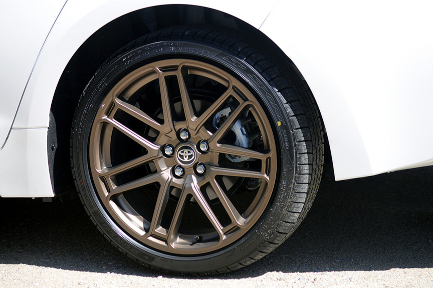 Go figure. You might assume any special edition Corolla called Nightshade would be painted black. But the 2024 model we tested this week was a dazzling shade of white called "Polar Cap." Of course, you can also buy a black Corolla Nightshade, even one painted Silver. The big news isn't so much color as the fact that the Nightshade is back in the Corolla lineup for 2024, after a year's hiatus in 2023. From an appearance standpoint, the Nightshade package turns the rather prosaic-looking stock Corolla SE into a highly appealing sports-oriented sedan (hatchback also available). You'll find a black front sport mesh grill, black power adjustable rearview mirrors (heated), black side rocker panels, rear diffuser and rear lip spoiler. All exterior badging is black. Nightshade also installs SofTex trimmed sports seats for driver and passenger, with contrasting gray sport fabric inserts. Thankfully, Toyota has jettisoned boring black alloy rims in favor of sparkling bronze finished, 14 spoke, 18 inch aluminum wheels shod with high grip (TW 340) Dunlop SP Sport 5000 radials (225/40R18).