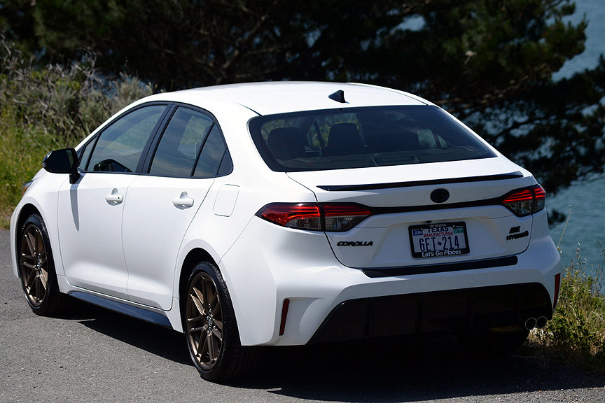 Toyota has given the latest Nightshade Corolla a sports suspension system that takes full advantage of the excellent grip offered by the Dunlop rubber. You can select a "Sport" setting from the drive mode control switch conveniently located on the nose of the center console. Sport Mode refines steering feedback as well as sensitizing throttle response. I found myself opting for Sport every time I climbed behind the wheel. The Nightshade Corolla has the suspension underpinnings to cope with an engine putting out twice the 138hp of our test hybrid. Even in its current underpowered form, the Nightshade is a blast to drive. With a curb weight of just 3,250 pounds, this five-seat sedan is agile, responsive, and easy to control. After a recent slew of lumbering SUV test vehicles, the lithe Corolla and its gumball Dunlops seemed like the epitome of sports sedan driving freedom.