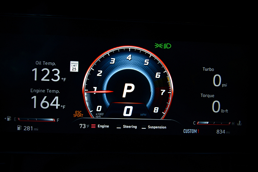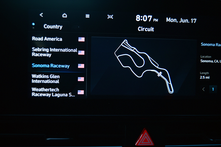 The cabin of the N is perfectly suited to hard driving stints. The steering wheel, festooned with myriad controls, epitomizes track racing gear, with oversize shift paddles, plus a Hyundai-only "N-Grin Shift and Power Shift" that allows the 276hp, 2.0 liter turbo four to over-boost to 286hp for a limited number of seconds. A similar "N Grin Control System" enables access to various track happy Drive Modes. Furthermore, you can fine tune virtually every aspect of vehicle performance from exhaust burble to rear slip of the e-LSD differential. Hyundai even includes a race track lap timer function with provisions for circuit length and specific track layouts from Laguna Seca to Sonoma Raceway to Road Atlanta and beyond.