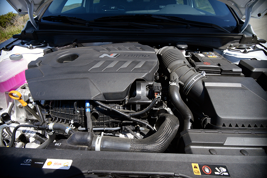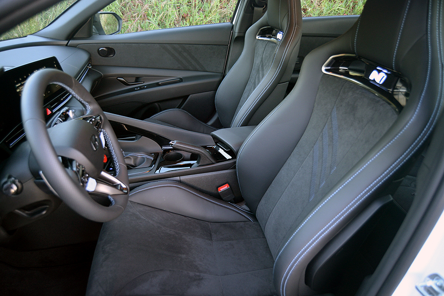 The full race bucket seats of the N are perfect for retaining your torso at maximum g-load. The only thing missing is a set of full race harnesses. Despite the cosseting design, the side panels of these seats are low enough to ease ingress and egress. Hyundai's exacting attention to detail shines through, literally, in the "N" trademark of the headrest, which is actually illuminated. The rest of the tidy interior is all business, just what the driver needs for maximum concentration in this family race car.