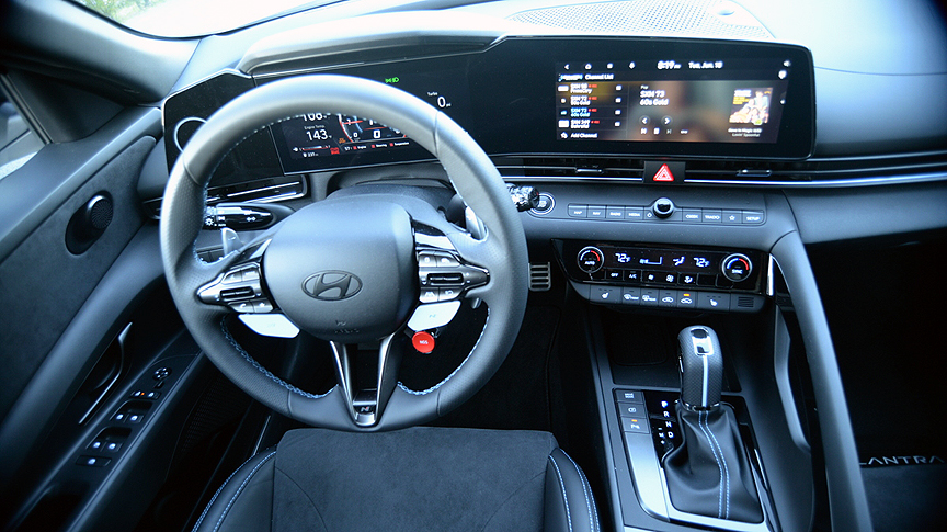 This year's N test Elantra featured the advanced 8-speed wet dual-clutch transmission, activated by sizeable paddles behind the race-style steering wheel. The 6-speed manual gearbox continues in production. The automatic proved lightning quick on both upshifts and downshifts. Sliding the console-mounted shift knob from its right gate to its left gate allowed manual retention of driver-chosen gears all the way to redline. On our extended Porsche foray, I left the stick in the manual gate, and manipulated the paddles to control gear choice. The downside of doing so is the engine spools up to redline so quickly that you're hard-pressed to keep it from bumping redline. Doing so instantly cuts all engine power. After a while I got the hang of the rhythm needed to keep ahead of the power curve. Just leaving the gearbox in Drive would be a bit more relaxing, but not as involving.