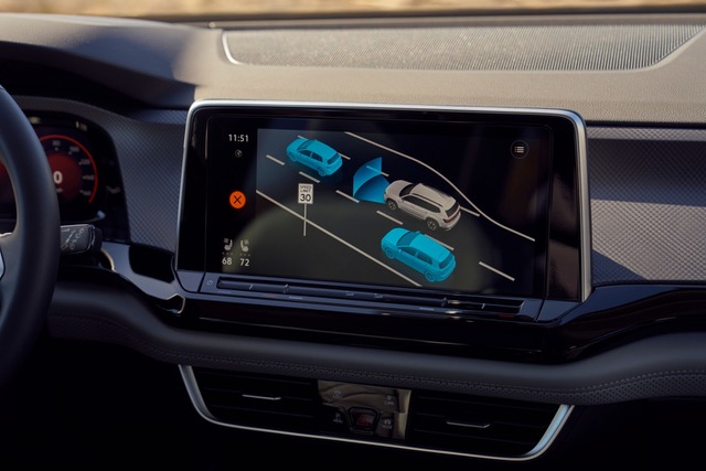 2024 Atlas exteriors have refreshed front and rear styling, now with standard LED headlights like those built into our R-Line’s gloss-black grille. Familiar brawny wheel wells make Atlas distinct within the SUV cohort. This year all Atlas adopt all-LED lighting: high-beam, low-beam, DRL and taillights. As our return trip lasted late into the night, automatic high beams with 900-lumen low beams made the highway bright, safe and driving relaxed.