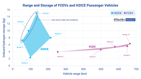 IDTechEx has analyzed the real-world performance of various H2ICE and FCEV vehicles to assess fuel consumption, and the results clearly show that FCEVs are more fuel-efficient. For a passenger car to run on hydrogen combustion and achieve a range comparable to a petrol/diesel ICE, it would need an enormous storage vessel – a tank 3.5x larger would be required to contain the same energy content.