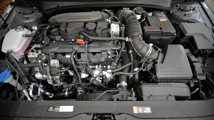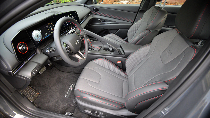 We loved the N Design's understated good looks. Our example, finished in Ecotronic Gray, with matching 18-inch alloy rims, was upholstered in a Black/Gray combination of nubby fabric counterpointed by Red stitching. The contour of the front "N Line Sport Seats" provided perfect lateral support in high-G Force corners without impeding access.. Hyundai interior stylists have perfected occupant retention by upholstering the high side wings of the front seats with nubby, circular indentations that guarantee you'll stay put when cornering loads try to dictate otherwise. Simply put, these are the best high-performance seats I have experienced in many years.