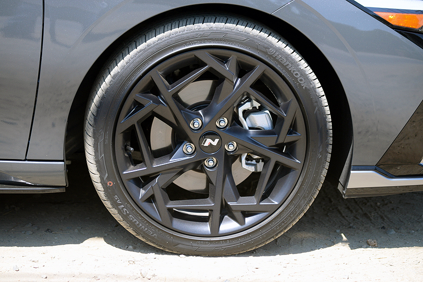 While the 201hp turbo inline-4 of the N Design gives away 86hp to the race-ready Elantra N's powerplant, you'll be hard pressed to call the N Design underpowered. In fact, the first time I nailed the throttle hard at a stop light, the front tires broke traction instantly and left a pair of affirmative black slashes on the pavement. The mid-range engine powering the N Line is more than adequate to all your acceleration requirements, with a quick spool up producing 0-60mph runs of 7 seconds and quarter-mile sprints of 15 seconds flat at 93mph. The wheel slip that allowed me to light the front tires was partially due to the hardness rating (TW 560) of the Hankook Ventus S1 4S all season radials (235/40R18) that were fitted. Slap on a proper set of TW 200 street-legal cheater slicks and your N Design sleeper Elantra will be leaving lots of Audis, BMWs and Alfas in the dust. Just like the factory backed team cars do in the IMSA Touring Car Championship.