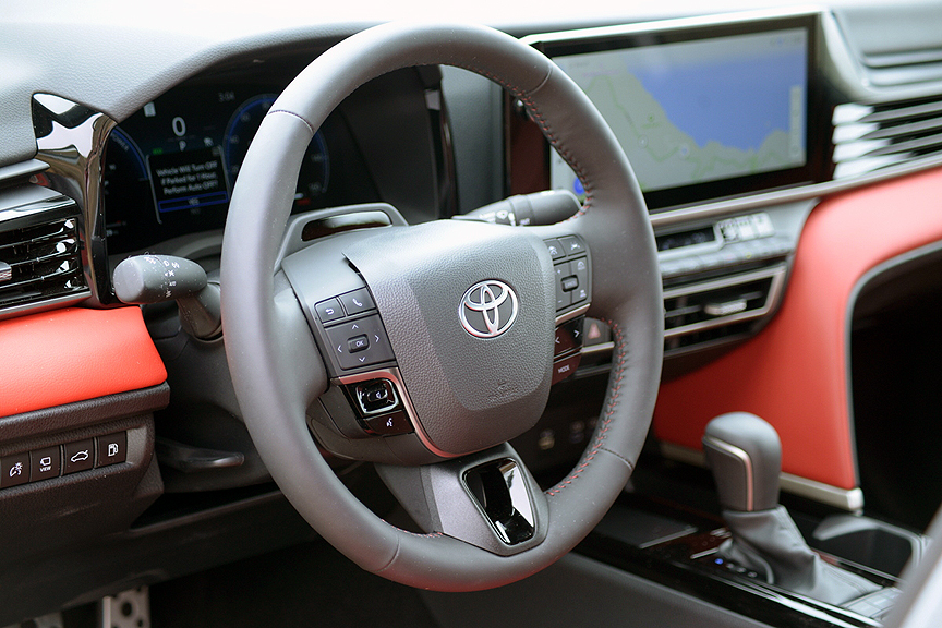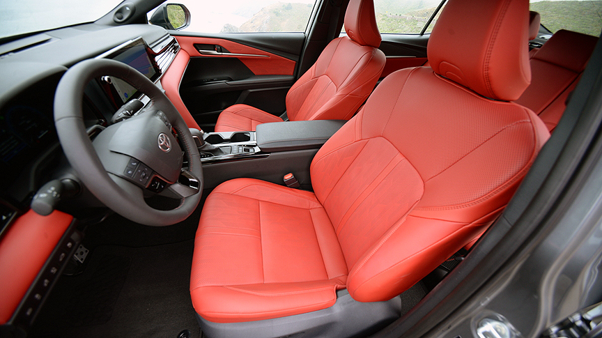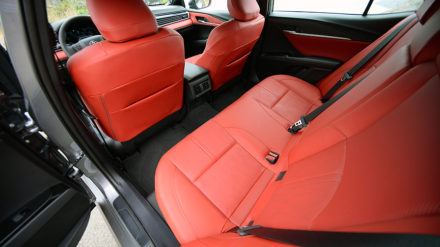 The XSE upgrades brake and throttle pedals with aluminum ribbing, an added enhancement to the spectacular-looking new interior. While the XSE's full leather seats are available in Black with Blue trim, I highly recommend selecting the "Cockpit Red" leather that graced the interior of our test car. To moderate the red blitz, interior designers have incorporated an artistic "Shooting Blade" pattern of perforations in the seating surfaces. The dash boasts a 12.3-inch digital gauge cluster directly in front of the driver. Next to it is a 12.3-inch audio multimedia screen that controls a 6-speaker system that is easy to modulate via touch gestures. Note that lesser variants of the Camry make do with a diminished size 8-inch media screen