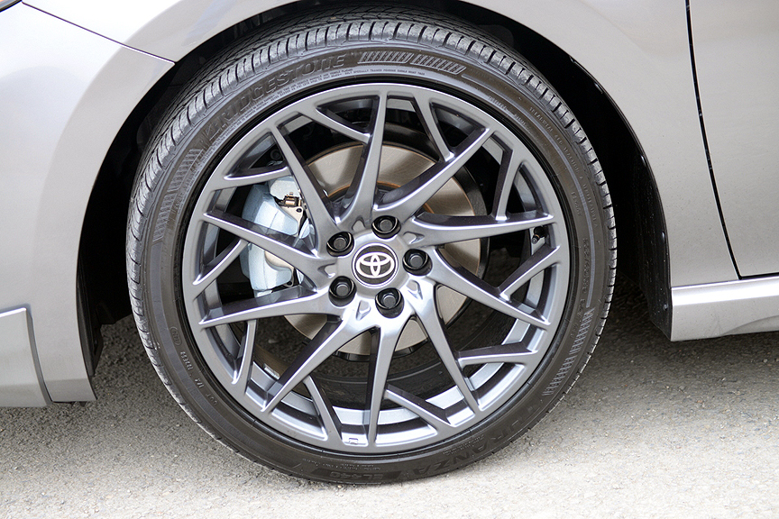 The final component of our test car's arresting appearance was its $1,500 set of 19-inch dark grey metallic wheels. These are the only 9-inch wide alloys you can buy from Toyota for the new Camry. They look great in combination with the Heavy Metal paint job. As an added benefit, they're shod with 235/40R19 Bridgestone Turanza EL440 M&S radials with a TW 480 rating. To keep these beefy rollers connected to the pavement, Toyota has upgraded the suspension of the new Camry for XSE duty. They have installed a larger diameter front anti-sway bar as well as newly recalibrated sport shocks. Even more important is the addition of a new pump motor in the brake actuator which enables the Camry to gain better brake feel. Toyota dubs their system Electronically Controlled Braking (ECB). As a long time victim of poor brake response in hybrid vehicles, I was more than pleasantly surprised by the excellent feel of the brake pedal in the new Camry.